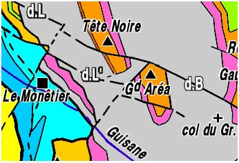 - à l'est, la partie occidentale de la zone houillère briançonnaise, d'ailleurs très modérément déformée au niveau des terrains paléozoïques (sur son bord ouest ses couches sont pratiquement horizontales, du moins jusqu'aux abord méridionaux du Monêtier-les-Bains). En aucun point l'on ne voit ce matériel houiller recouvrir en chevauchement des unités sous-jacentes, ce qui donne l'impression d'un enracinement profond de ce paléozoïque briançonnais.