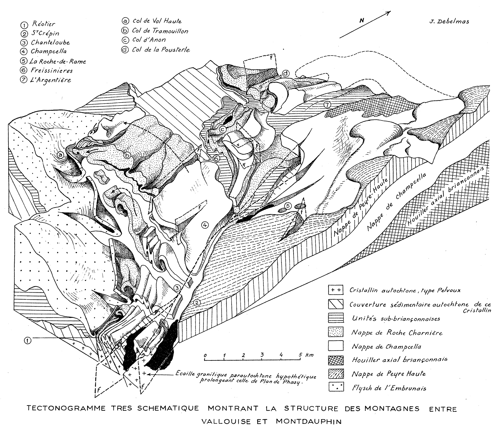 Tectonogramme des montagnes entre Réotier et Vallouise (extrait recadré de J.DEBELMAS 1955a, pl. VI)