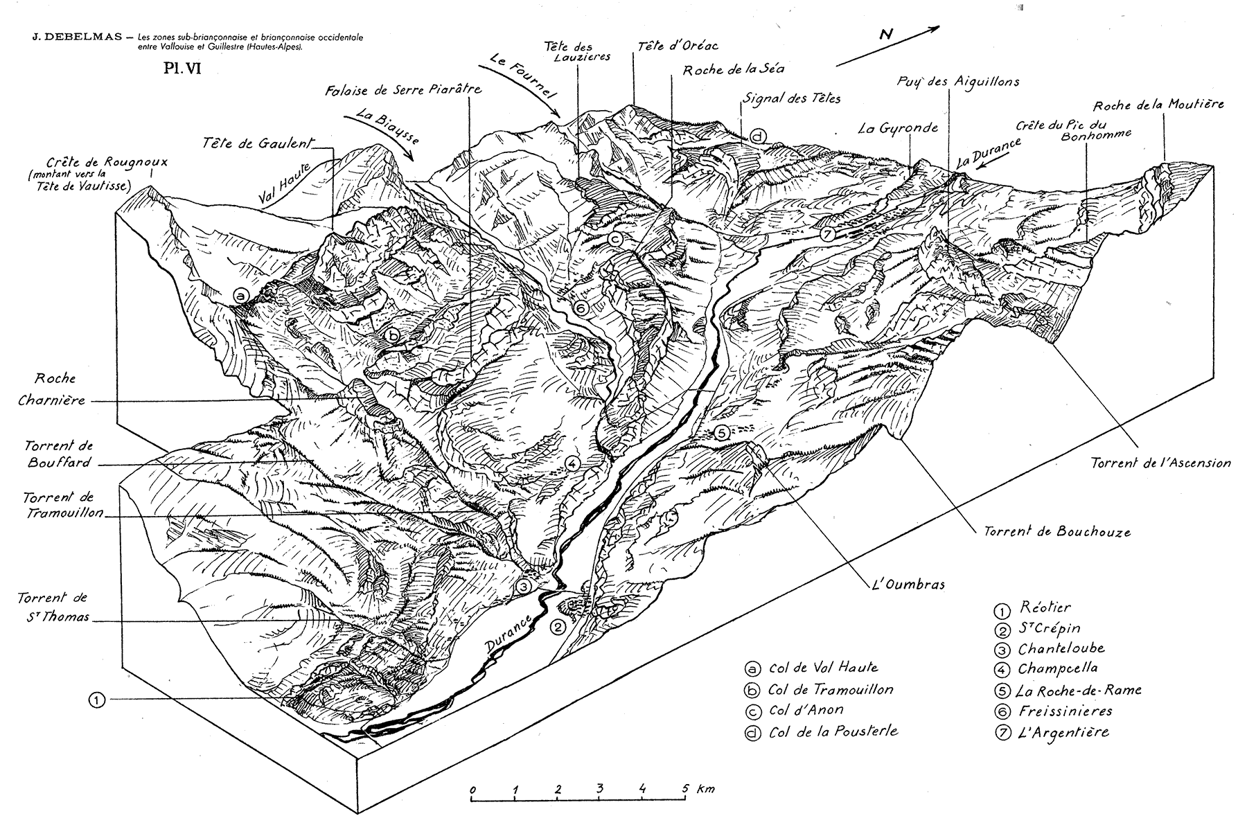 Noter la manière dont la nappe de flysch de l'Embrunais est rebroussée en crochon synclinal ("synclinal de Saint-Clément") sous la a surface de l'accident frontal briançonnais et l'inexistence de témoins de cette nappe au nord de l'entaille de la vallée de la Biaysse.