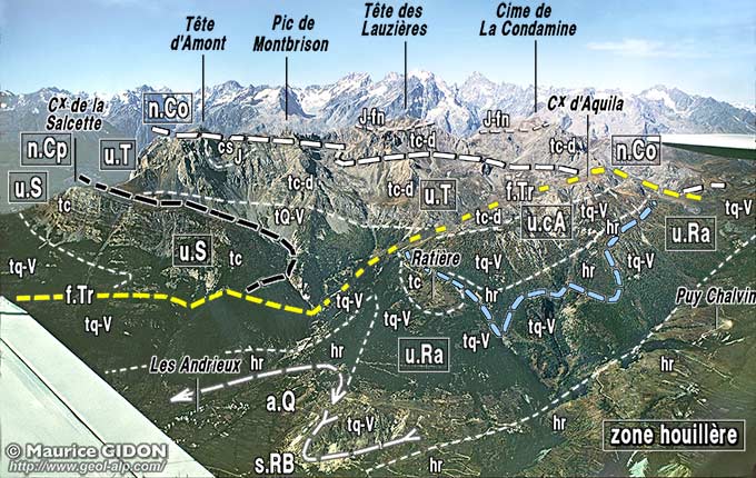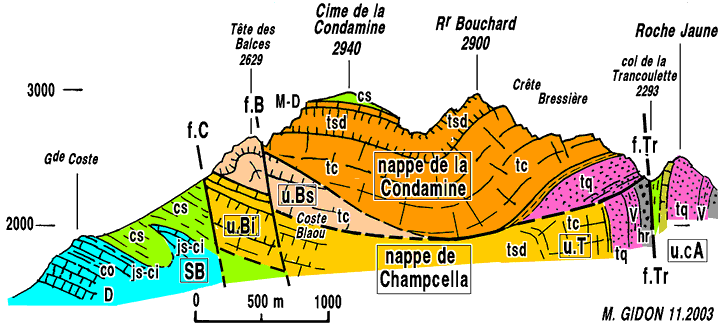 La partie haute du versant s'avère toujours formée, bien sûr, par la dalle des calcaires et dolomies du Trias moyen de la nappe de la Condamine. La partie basse des abrupts montre un autre ensemble de terrains calcaréo-dolomitiques, qui ont donc été rattachés à la nappe de Champcella.