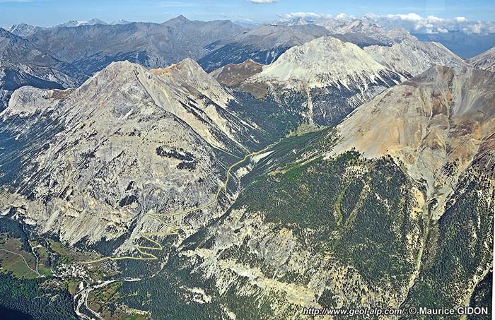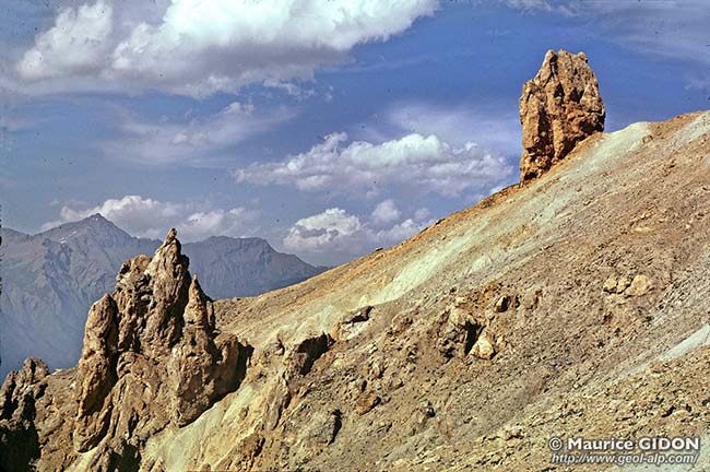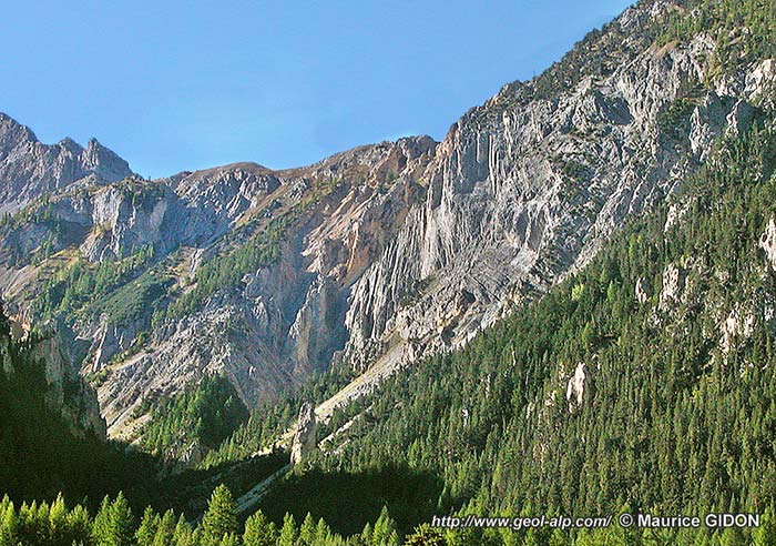 A cette même latitude on voit du côté italien que les couches ainsi plissées sont recouvertes par un important enduit de cargneules qui est plaqué contre le versant selon une surface très redressée qui les coupe en biseau en garnissant la pente de rive gauche du ravin. Il s'agit de celles qui soulignent la surface de chevauchement de l'unité briançonnaise des Sette Fontane, reployée par les plis affectant celle de la Côte Névachaise.