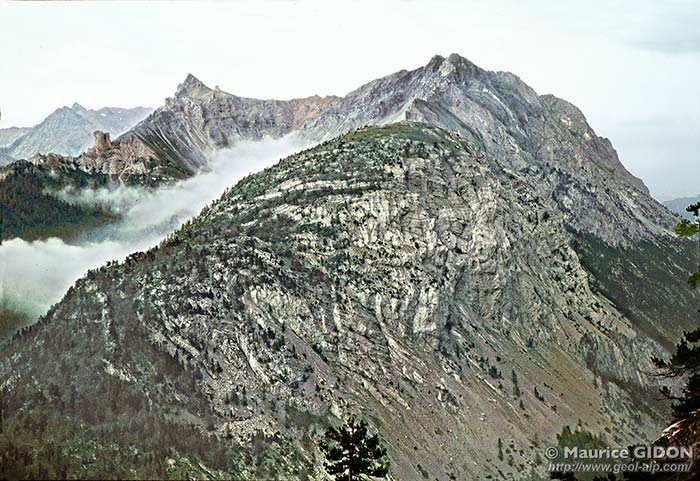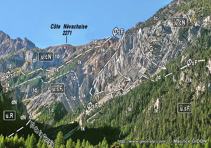 D'autre part il est remarquable que cette unité est posée presque à faible pendage sur l'unité sous-jacente, de la Côte Névachaise ; or les couches de cette dernière se redressent, puis se tordent en un synclinal "de la Roche Bernaude" (voir le deuxième cliché de la présente page), ce qui pourrait représenter un crochon d'entraînement (à vergence est) induit par sa mise en lace.
