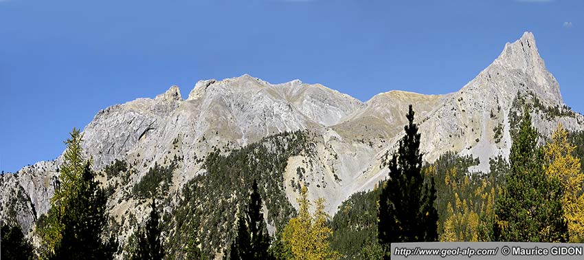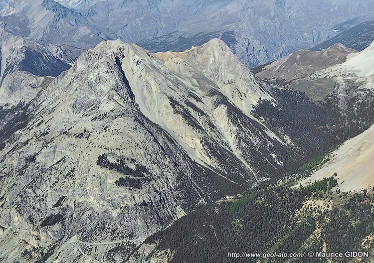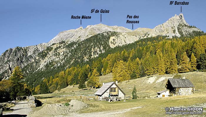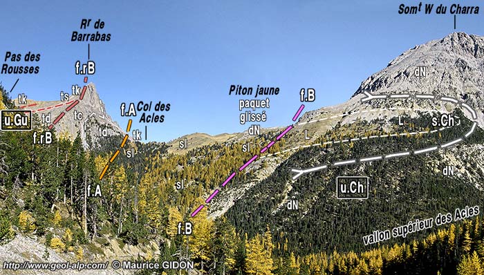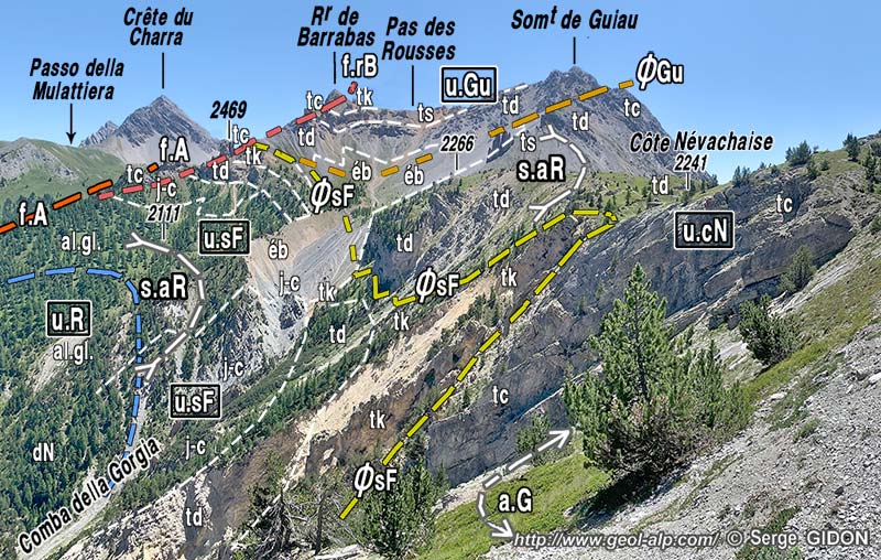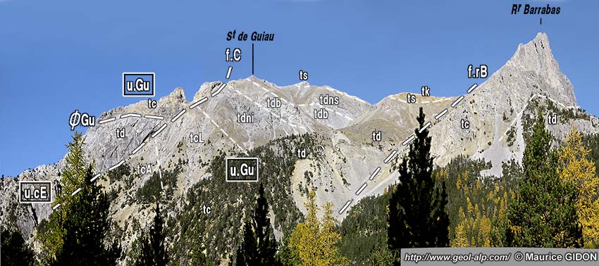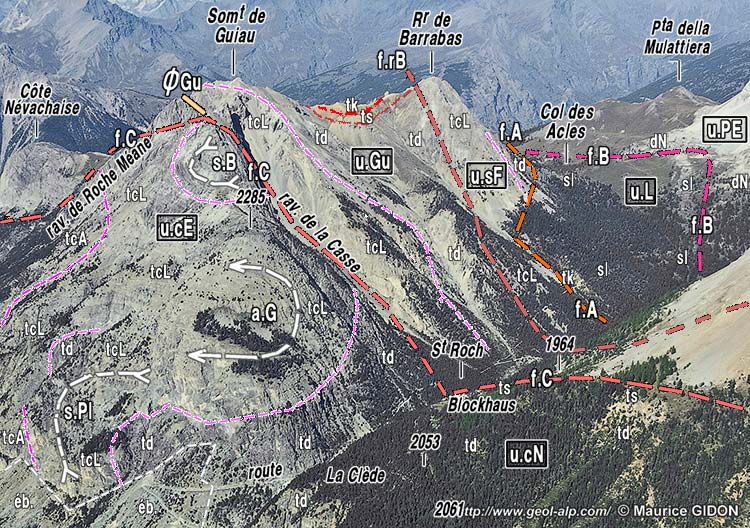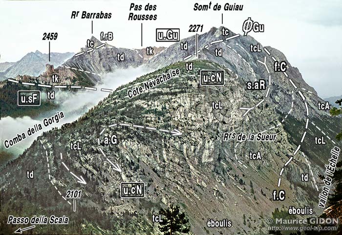 Plus au sud la crête culmine au sommet de Guiau, d'où elle se dirige vers l'est jusqu'au col des Acles en passant par le Rocher de Barrabas. Du côté septentrional on constate que la structure se modifie brutalement car ce sommet est formé par un chapeau de calcaires triasiques, disposés à l'endroit, qui reposent en discordance sur ceux presque renversés de la Côte névachaise : ils représentent la semelle d'une "unité de Guiau" dont les couches forment le versant sud de la crête (voir plus loin).