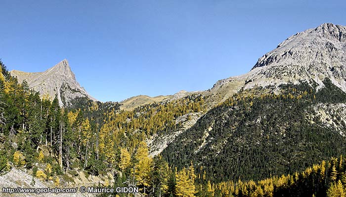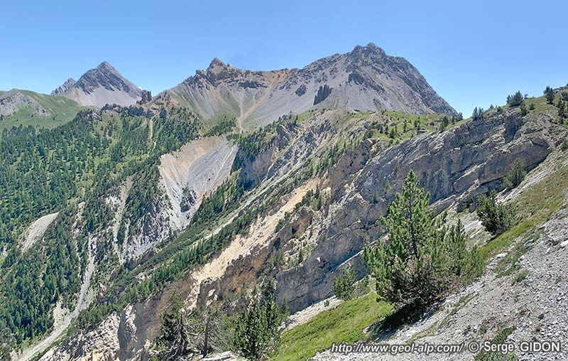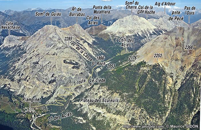 Du côté septentrional les pentes qui s'élèvent depuis le Pian del Colle sont drainées par le profond ravin de la Comba della Gorgia qui suit vers le sud la crête frontière franco-italienne de la Côte Névachaise, de sorte que le versant italien de cette crête décrit un rentrant vers le SW. La rive droite (orientale) de ce ravin donnerait une excellente coupe structurale si elle n'était pas aussi encombrée à mi-hauteur par un fort colmatage de formations quaternaires, principalement ébouleuses.