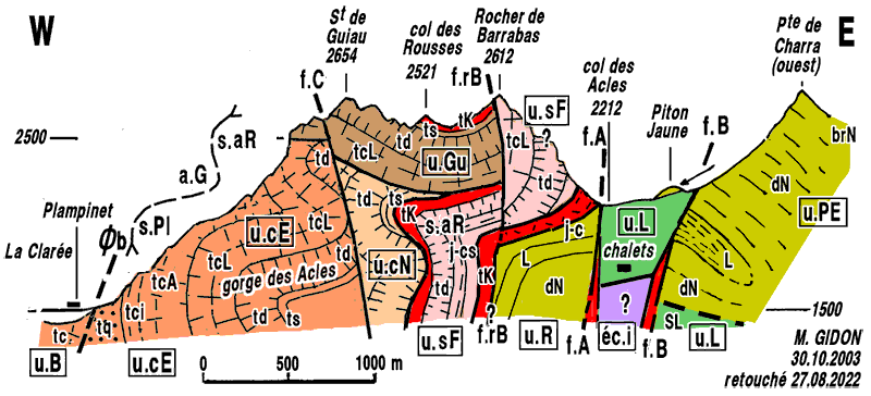 En fait cette unité est en majeure partie juxtaposée contre celle du col de l'Échelle par la faille du ravin des Casses, d'orientation N-S, qui passe peu à l'ouest du sommet de Guiau. Dotée d'un fort pendage vers l'est elle sectionne les plis de l'unité de l'Échelle. Son rejet est en fait difficile à préciser : il est tel que ni le biseau l'unité de la Côte Névachaise ni les témoins de l'unité du Rouas ne réapparaîsent sur ce versant (où il devrait pourtant ressortir, après passage en tunnel sous l'unité de Guiau), ce qu'un simple abaissement de sa lèvre orientale ne semble pas suffire à expliquer. |