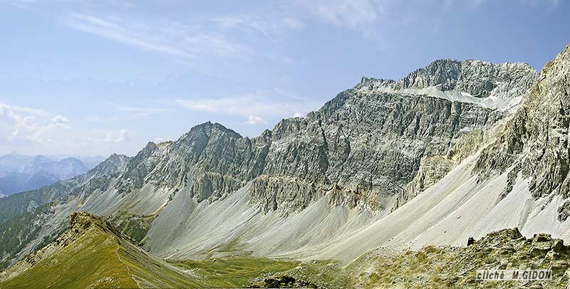 siliceux briançonnais, comportant des micaschistes, qui traverse les pentes en direction du col de Fontaine Froide en jalonnant ainsi une surface de cassure pentée modérément