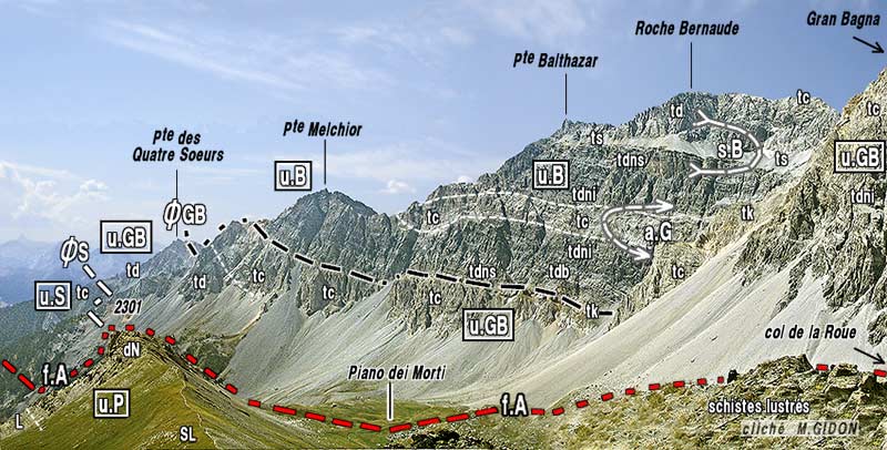 ![]() Les abrupts orientaux du chaînon des Rois Mages vus du nord-est, depuis le point coté 2828, sur la crête à l'est du col de la Roue. u.B = unité briançonnaise de Roche Bernaude ; a.G = anticlinal de la Pointe Gaspard (la charnière dessinée est effectivement visible à cet endroit dans la falaise) ; s.B = synclinal de la Roche Bernaude ; ØGB = surface de chevauchement (renversée) de l'unité briançonnaise de Gran Bagna (u.GB) : vers la droite, elle passe dans une profonde ravine, masquée par l'éperon sud de la Gran Bagna ; son pendage s'y redresse fortement, par enroulement autour du flanc oriental de l'anticlinal de la Planette. ØP = surface de contact tectonique de l'unité piémontaise externe des Rocce del Rouas (u.P) avec u.GB. f.A = faille ouest des Acles : son tracé, masqué en amont du Pian dei Morti, y suit le haut vallon della Rho puis doit se raccorder, au nord (à droite) du col de la Roue, à la faille d'Arrondaz du versant mauriennais. |