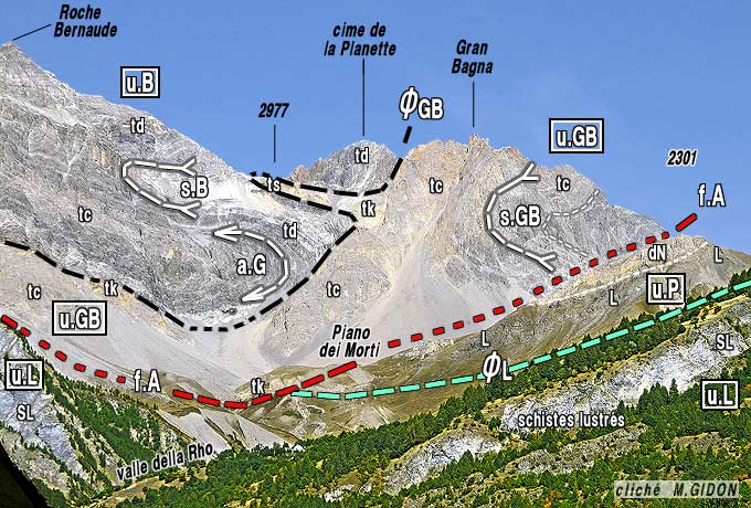 Toutefois le versant SE du Gran Bagna donne une entaille suffisamment oblique à ces axes pour y mettre splendidement en évidence le dessin des charnières et le fait que les surfaces de charriage séparant les unités sont affectées par ces plis.