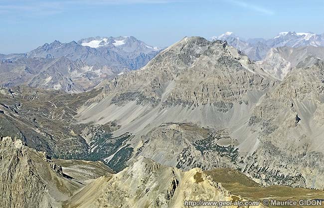En outre cette coupe montre que le matériel briançonnais de ce chaînon semble reposer sur des schistes lustrés qui apparaissent ici, apparemment dans une demi-fenêtre* fermée vers le nord dans le vallon de Fontaine Froide (voir la page "vallons du Charmaix").