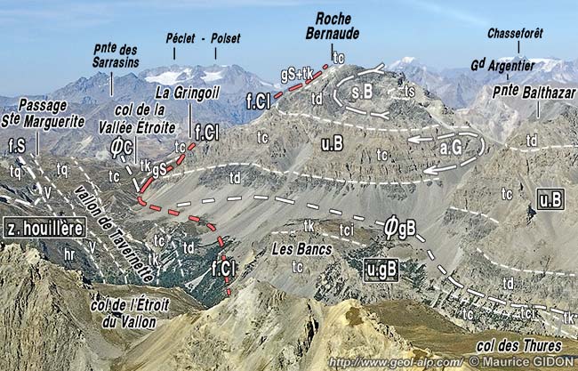 ![]() L'extrémité septentrionale du chaînon des Rois Mages, vue du nord-ouest, depuis le col des Bataillères (en avant-plan le plateau des lacs de Sainte-Marguerite, où se trouve le refuge du Thabor). a.G = anticlinal couché de la Pointe Gaspard (unité de la Roche Bernaude) ; s.GB = synclinal de l'unité de la Gran Bagna ; ØGB = chevauchement basal de l'unité de la Gran Bagna : sa portion visible ici est presque verticale car cette unité s'y enroule pour passer à l'envers sous le flanc oriental de l'anticlinal de la Planette. Le versant opposé de la crête de Gran Bagna - Roche Bernaude est visible sur les derniers clichés de la présente page. Crêtes d'avant-plan par rapport à la Vallée Étroite : f.Cl = faille de la Clarée (en majeure partie cachée derrière les crêtes de La Gingoil et de Château Léger) ; ØC = chevauchement de l'unité du Clos (voir la page "Sarrasins") ; f.S = faille du Séru (entre ØC et f.S la succession stratigraphique du col de la Vallée Étroite est le prolongement vers le sud de celle du Roc Mounioz : voir la page "Sarrasins") ; f.S = branche ouest de la faille du Séru (voir la page "Thabor NE"). |