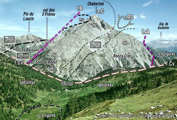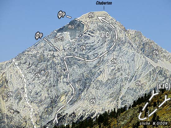Chaberton, vu des prairies du Gondran ØP = chevauchement du Piémontais externe sur les "écailles intermédiaires". L'affleurement de leur matériel, au coeur de l'anticlinal couché du Chaberton (a.C), est partiellement masqué par la crête secondaire qui descend du sommet vers le SW. s.rC = disposition du synclinal des Rochers Charniers (hors champ, plus à droite). |
