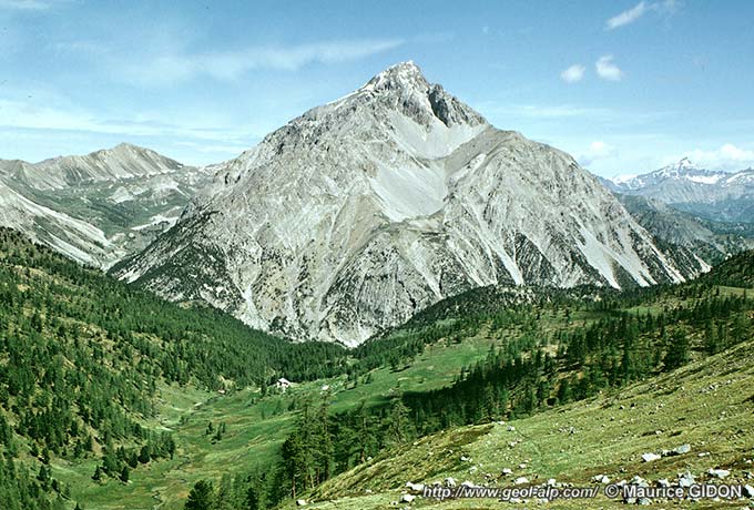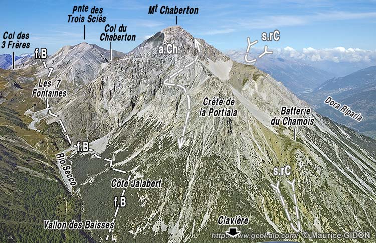 Au nord de Clavière (voir la page "Montgenèvre") le Mont Chaberton, avec les 3131 m d'altitude qu'atteint son sommet est une des plus hautes cimes du Briançonnais. C'est le point culminant d'une puissante et compacte masse rocheuse qui domine du côté oriental la localité italienne de Cesana-Torinese, la plus élevée de la vallée de la Dora Riparia. Elle est tranchée du côté sud par l'abrupte entaille de la Piccola Dora, qu'emprunte la route pour rejoindre le village de Clavière à l'extrémité orientale de la trouée frontalière du Montgenèvre.