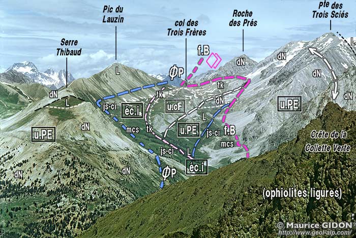 ![]() Le versant ouest du Chaberton et le vallon des Baisses (drainé par le Rio Secco) vus du sud, depuis les abords de la Collette Verte. f.B (en rose) = faille des Baisses : on a symbolisé par un petit schéma de la même couleur la disposition de sa surface de cassure, pentée vers l'ouest. u.PE = unités piémontaises externes des Fournéous (à l'endroit : partie gauche du cliché), du vallon des Baisses (renversée : centre) et du Chaberton (subverticale : partie droite du cliché) ; ØP (en bleu) = surface de chevauchement de la première de ces unités. éc.i = "écailles intermédiaires", constituées de lames de micaschistes (mcs), de quartzites et de calcschistes du Malm - Néocomien (js-ci) ; u.cF = unité briançonnaise du Clos des Fonds, entourée de cargneules : elle est interprétée comme pointant au coeur d'un anticlinal de nappes déversé vers l'est, dont la charnière du Chaberton serait la voûte (cf. coupe schématique de l'aperçu général). |
