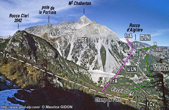 Du côté oriental (versant italien) du Chaberton l'épaisse succession de bancs de dolomie du flanc normal du synclinal des Rochers Charniers est tranchée la faille sub-verticale de la Rocca d'Aiglière (voir le premier cliché de la présente page). Cette faille met en contact ces couches avec les unités de schistes lustrés ligures et coupe aussi, du côté de ces dernières, la surface de charriage qui superpose les "roches vertes" de l'unité du Lac Noir aux épais schistes lustrés des pentes de la vallée de Cesane-Torinese (attribués au Crétacé supérieur). C'est donc une importante cassure mais pas un chevauchement (elle est même postérieure à ceux reconnus par ailleurs).