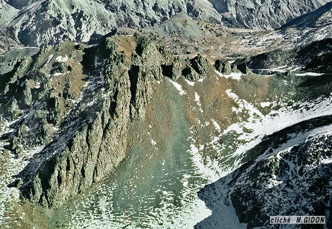 Ces deux cassures ont nécessairement un rejet très important car elles juxtaposent au nord (voir les pages "Montgenèvre" et "Chaberton") comme au sud (voir la page "Cervières") des ensembles rocheux très différents, puisque dépourvus de tels affleurements de matériel magmatique. En fait il s'agit du matériel piémontais externe, sur lesquels le matériel magmatique du Chenaillet devrait normalement reposer par charriage (puisque il est d'origine plus interne) : c'est d'ailleurs bien une telle disposition que l'on y observe à la faveur de la petite fenêtre ouverte par le vallon de Gimont.