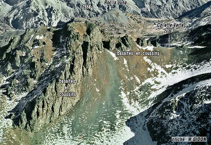 « ... l'observation détaillée de l'architecture de l'ophiolite du Chenaillet, et plus particulièrement de l'unité volcanique, démontre que les édifices volcaniques simples et composites ont été totalement préservés de la déformation alpine. Il en va de même pour les unités de socle affleurant aux alentours. D'autre part il apparaît que la morphologie actuelle des reliefs correspond à une surface structurale qui, aux effets de l'érosion près, reproduit les reliefs océaniques originels.