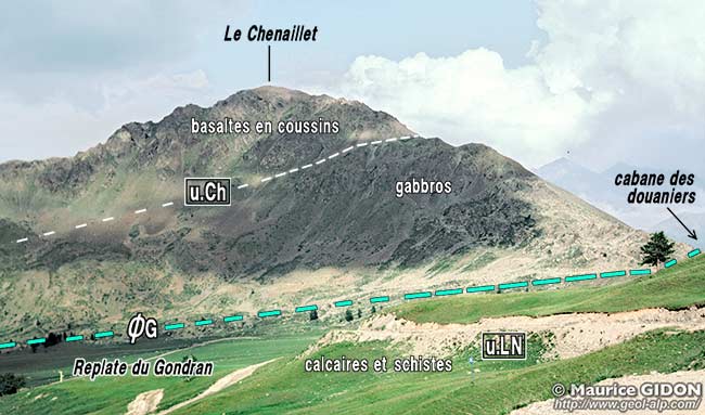 ![]() Le Chenaillet (versant ouest), vu du sud-ouest depuis les abords du col entre Gondran et Janus. u.Ch = unité du Chenaillet (nappe ophiolitique supérieure) ; u.LN = unité du Lago Nero (ici : sédiments de couverture de la nappe ophiolitique inférieure) ; ØG = accident du Gondran (chevauchement ?) séparant les deux unités. |