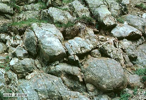 Un amas de laves en coussins montrant la surface des boudins de lave, dégagée par l'érosion, telle qu'elle devait se présenter sous la mer lors de l'effusion du magma. |
