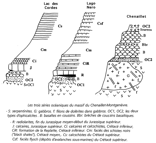 Une comparaison avec les autres ophiolites des Alpes, celles de la Corse et celles de l'Apennin montre que les ophiolites des deux nappes du massif Chenaillet-Montgenèvre ne sont pas des exceptions, mais rentrent bien dans un cas général. Sur 1.000 à 1.500 kilomètres en suivant la longueur de l'océan alpin, de Florence à Salzbourg en passant par Aoste, les relations des ophiolites entre elles et avec leur couverture de sédiments océaniques restent remarquablement homogènes. Des roches originaires du manteau, péridotites serpentisées avec quelques gabbros intrusifs, ont été portées à l'affleurement au fond de l'océan alpin. Elles ont été recouvertes partout d'une couche (quelques centimètres à quelques dizaines de mètres) de roches détritiques, les ophicalcites OC2, à ciment calcaire et cailloux d'ophiolites qui sont surtout des péridotites serpentinisées, parfois aussi des gabbros. Quelques coulées de basaltes en coussins se sont épanchées, ici et là, sur cette couche sédimentaire. Ce n'est qu'après, à partir de 170180 Ma, que se sont déposés les sédiments océaniques, radiolarites, calcaires, etc.