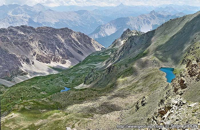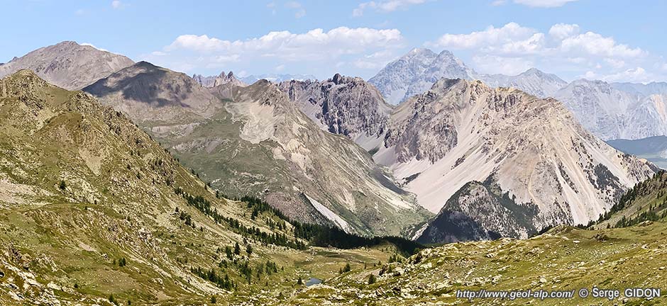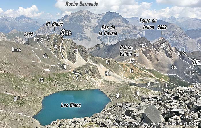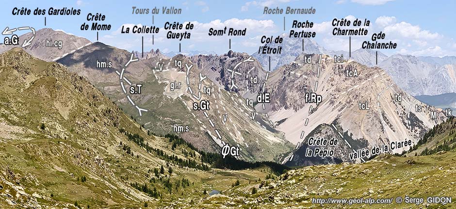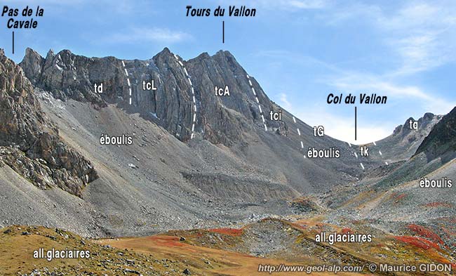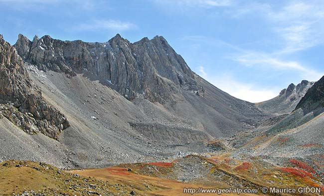 Du côté oriental de la crête des Gardioles le torrent du Vallon a tracé son lit en suivant la limite entre les formations siliceuses de sa rive droite (occidentale) et celles calcaréo-dolomitiques de sa rive gauche (c'est donc une "combe monoclinale"*). C'est ce que montre parfaitement la coupe naturelle de son extrémité septentrionale, au col du Vallon (vue suivante), grâce au fait que la succession clairement stratigraphique des couches y est tranchée orthogonalement par la crête secondaire, E-W, qui va des Tours du Vallon au Rocher Blanc et au Pic du Lac Blanc (voir aussi la page "Thabor sud").