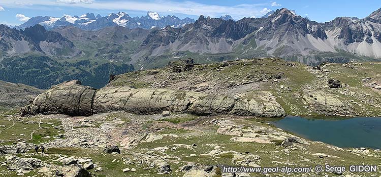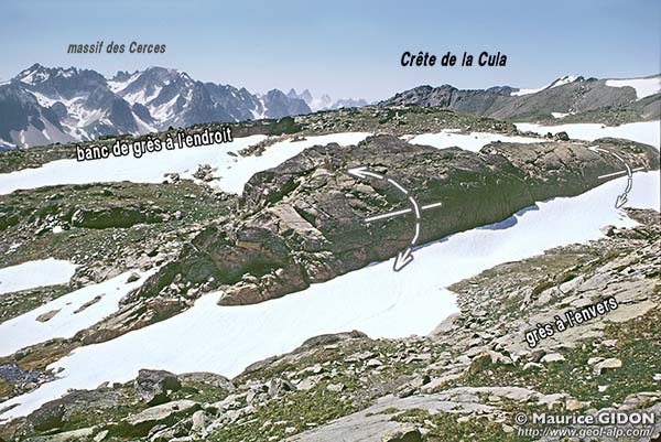 Charnière d'un anticlinal déversé vers l'est affectant un gros banc de grès à conglomérats dont le toit est dénudé par l'érosion des schistes qui l'enveloppent ; formation conglomératique inférieure. Lieu-dit "Les Gardioles", alt.2680, sur le chemin montant au Pic du Lac Blanc par son versant ouest. Noter la prédominance des schistes ("formation du Chardonnet") dans le paysage d'arrière-plan à la crête de la Cula. |