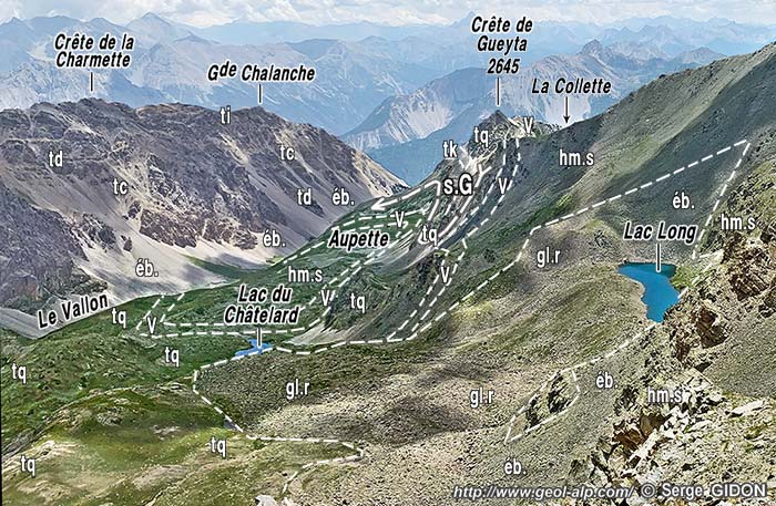 Plus au sud, au niveau des chalets du Vallon et de l'Aupette, les quartzites laissent réapparaître à flanc du versant une langue de schistes houillers : ceci est dû à la présence, au flanc est de ce grand anticlinal, d'un repli déversé vers l'est. Cet accident s'amplifie vers le sud au point que, plus àl'ouest dans le versant, les quartzites sont pincés en un synclinal que l'érosion a respecté et mis en saillie à la Crête de la Gueyta (voir aussi la page "Névache").