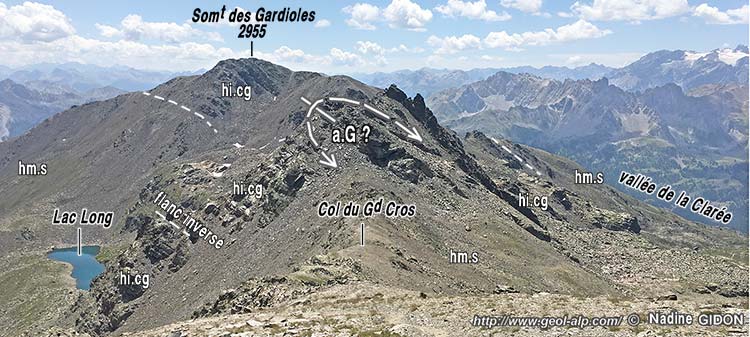 La charnière majeure de l'anticlinal de la Gardiole doit passer sensiblement le long de la crête, plutôt sur son flanc ouest car nulle part elle n'est observable aux alentours de la ligne faîtière ; quoi qu'il en soit sur le versant est de la crête, ainsi que vers le nord, au Pic du Lac Blanc, ce sont de nouveau les couches de la formation du Chardonnet qui affleurent et leurs polarités sédimentologique montrent qu'elles sont là en position de flanc inverse par rapport à ce grand pli. |