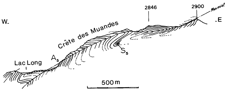 ![]() Coupe de détail montrant la disposition des couches et le déversement des plis ("A5", "S5") qui s'accentue vers le haut du versant, par R. FABRE 1982. |