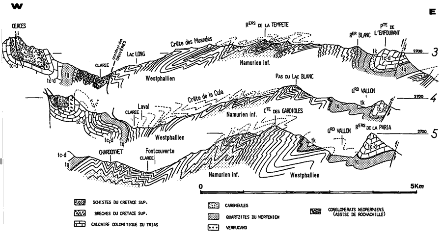 ![]() Coupes transversales à la haute vallée de la Clarée et à la crête des Gardioles, par R. FABRE 1982 (présentation retouchée) |