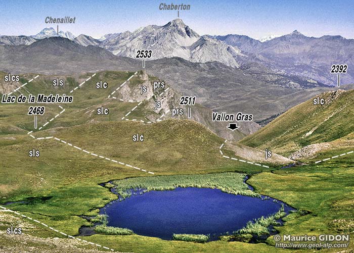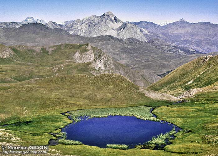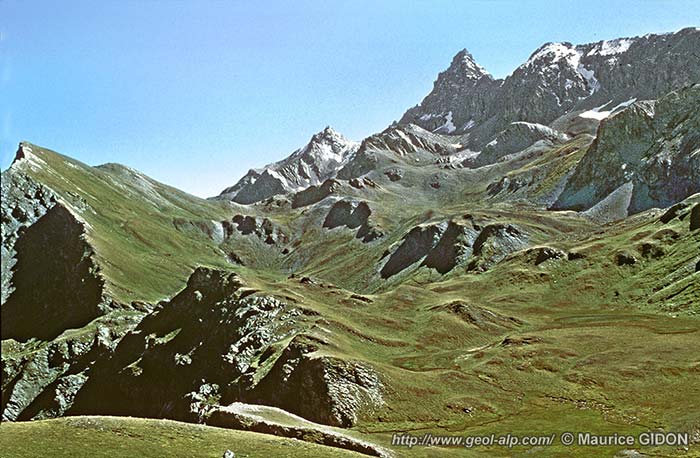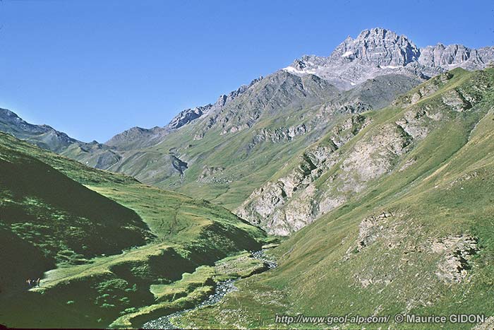 de dolomies noriennes, qui repose sur les schistes lustrés affleurant en contrebas dans le versant occidental de la haute vallée de la Cerveyrette (ils réapparaissent aussi à l'ouest,