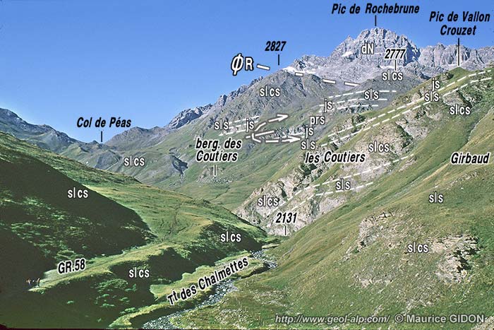 Mais on remarquera que cela suppose que l'unité de Rochebrune se soit mise dans cette situation par un transport provenant de l'ouest, alors que, dans cette direction, elle bute contre la faille des Acles (du Laus-Côte Belle) et qu'au delà de cette dernière on ne trouve plus rien qui puisse lui correspondre. Cette difficulté avait suggéré que cette cassure des Acles serait la cicatrice d'un chevauchement originellement moins penté, par lequel cette unité se serait en quelque sorte expulsée d'ouest en est depuis un domaine plus profond que celui mis à nu par l'érosion. Mais cette hypothèse ne s'accorde vraiment pas avec la géométrie observable le long de la faille. En outre elle pose néanmoins le problème de la situation originelle de ce matériel piémontais (puisqu'il n'est pas renversé, contrairement à ce que montrent partout les confins du briançonnais et du domaine des schistes lustrés et que ce renversement s'observe notamment à l'ouest d'Arvieux). |