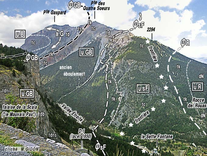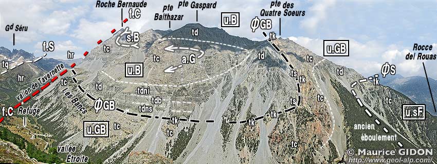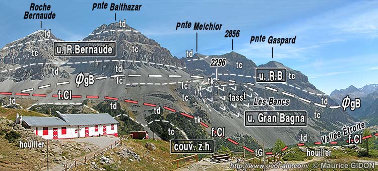Le chaînon des Rois Mages, vu de profil ouest depuis la mine du Blanchet (rive droite de la haute Vallée Étroite). u.R.B = unité de la Roche Bernaude ; ØgB = surface de chevauchement (renversée) de l'unite de Gran Bagna ; f.Cl = faille de la Clarée ; couv. z.h. = succession (renversée) de la couverture de la zone houillère briançonnaise (flanc inverse de l'anticlinal de la Grande Montagne). |