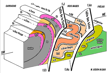 ![]() Le chaînon des Rois Mages et ses abords sud-orientaux en versant italien, vus d'enfilade, du sud - sud-est, depuis le col des Acles (frontière franco-italienne à l'est de Névache) f.Cl = faille de la Clarée ; f.A = faille des Acles (f.AW = branche ouest, principale ; f.AE = branche est = faille des Baisses) u.B = unité briançonnaise de Roche Bernaude ; u.GB = unité briançonnaise de Gran Bagna ; u.sF = unité briançonnaise des Sette Fontane ; u.R = unité piémontaise externe des Rocce del Rouas ; u.gA = unité piémontaise externe du Grand Argentier ; u.L = unités ligures. a.G = anticlinal couché de la Pointe Gaspard ; s.B = synclinal couché de la Roche Bernaude. ØGB = surface de chevauchement (renversée) de l'unité briançonnaise de Gran Bagna ; ØPE = surface de contact tectonique (renversée) de l'unité u.PE avec u.GB. (voir le bloc diagramme schématique interprétatif, à la fin de cette page et la coupe de l'extrémité sud du chaînon à la page "Échelle") |