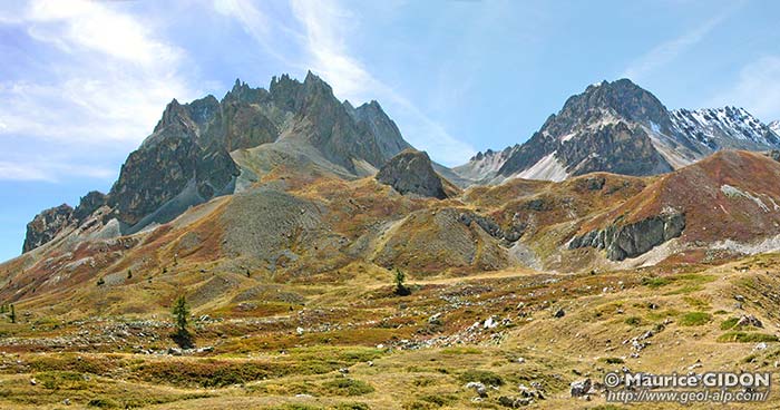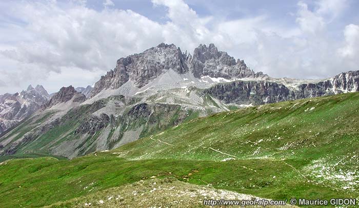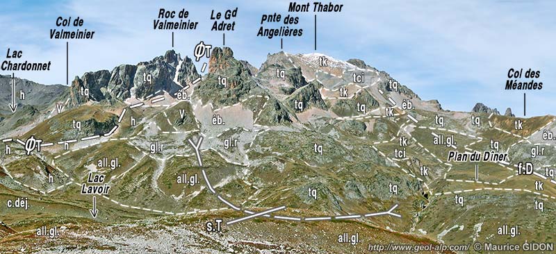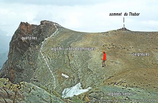 Cette topographie traduit l'existence d'un redoublement de la puissante lame des couches siliceuses permo-triasiques (Verrucano et quartzites) par le chevauchement du Thabor. Cet accident se poursuit au nord du sommet, dans le versant de la Grande Montagne, où il sépare le Mont Thabor du Pic du Thabor (voir la page "Nord du Thabor"). La surface de cassure de cet accident est redressée presque à la verticale : cela correspond au fait qu'on se trouve là dans le flanc ouest du synclinal du Thabor et qu'elle a été basculée, avec les couches qu'elle affecte, lors de la formation de ce pli (ce qui implique donc que ce plissement a été postérieur à l'étape qui avait créé le chevauchement).
