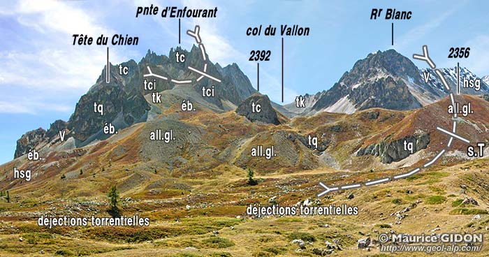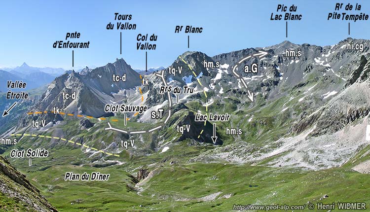 Du côté méridional le vallon du Lac Lavoir est fermé par la crête du Rocher Blanc. Contrairement à ce que son nom suggère, ce sommet est formé par les schistes et grès noirs du Houiller inférieur (formation de Chardonnet), disposés à l'envers (flanc oriental de l'anticlinal de la Gardiole : voir la page "Gardioles"). La suite de son arête orientale montre la même succession mésozoïque qu'au nord du vallon du Lac Lavoir : les quartzites de la crête ouest du col du Vallon et les affleurements de Trias moyen calcaréo-dolomitique qui forment à l'est la crête d'Enfourant, tous disposés à l'envers, représentent le flanc ouest du synclinal du Thabor.