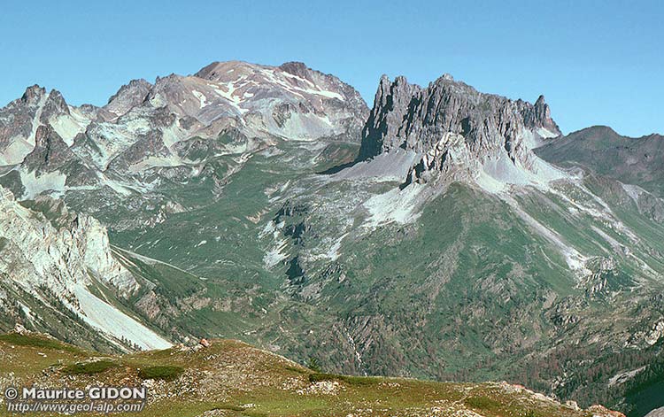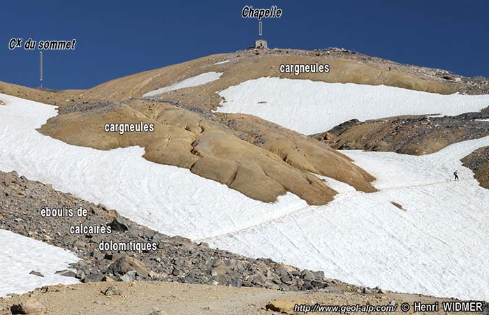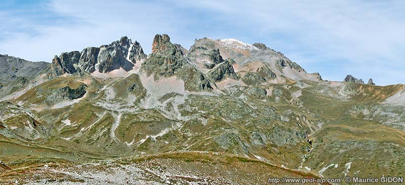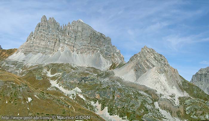 ![]() Le sommet des abrupts occidentaux du Mont Thabor vu du sud : on y voit les premières couches carbonatées du Trias reposer en succession stratigraphique normale sur les quartzites werféniens (J.-C. Barféty lutte contre le vent du nord ...). |