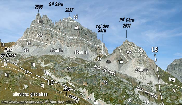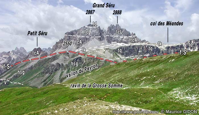 Mais, sur le versant oriental de ce sommet, ses calcaires triasiques viennent directement en contact avec le houiller des pentes occidentales du vallon de Tavernette. Ce contact tectonique, presque vertical, correspond à la faille du Séru.