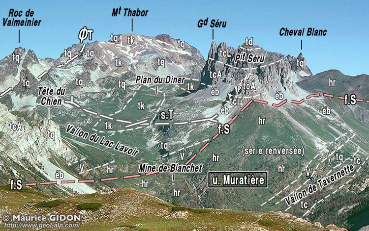 ![]() Les pentes méridionales du vallon du Lavoir, vues du nord depuis le col des Méandes (Grand Séru). (cliché original obligeamment communiqué par Mr. H. Widmer). s.T = synclinal du Thabor ; a.G = anticlinal des Gardiols. Le secteur gauche (Tours du Vallon, Enfourant) est représenté de façon simplifiée (voir plus de détails à la page "Crête du Vallon"). |