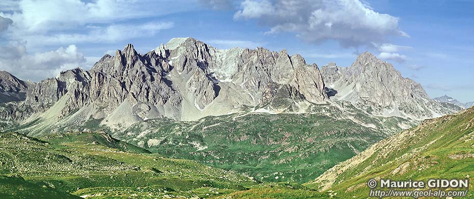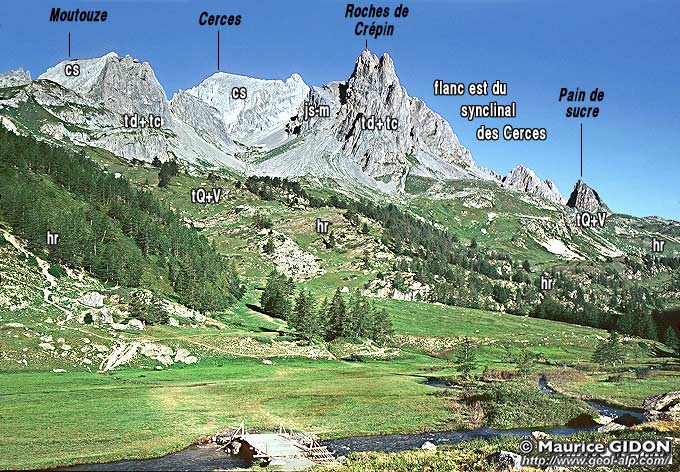 ![]() Le chaînon des Cerces et la Clarée vues du sud-est, depuis le pont de départ du sentier des Béraudes, aux abords des chalets de Laval Les aiguilles des Roches de Crépin sont particulièrement déchiquetées, sans doute en raison de ce que les strates de calcaires dolomitiques qui les constituent sont verticales (du fait qu'elles appartiennent au flanc oriental du synclinal) : on trouvera dans le site "Vallouimages" une page consacrée à l'évolution de leur aspect, suite aux éboulements qu'elles ont subi récemment. |
