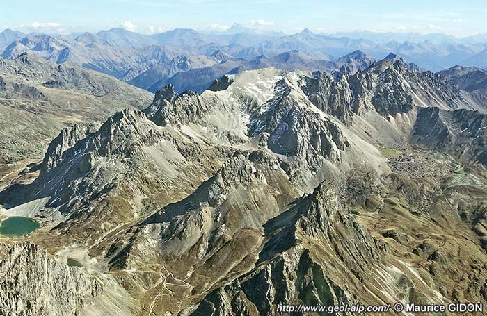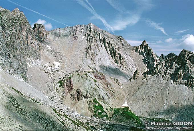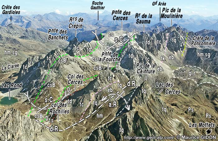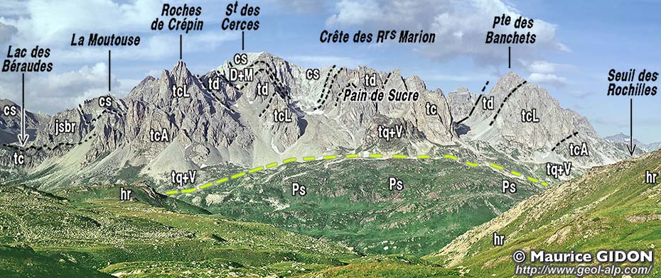 Au sud du sommet des Cerces la crête de la Moulinière voit même les calcaires triasiques s'amincir sous l'effet de cette érosion au point de disparaître et de laisser les marbres en plaquettes reposer directement sur les quartzites werféniens au sud de la latitude du lac des Béraudes (au col et à la Roche des Béraudes).