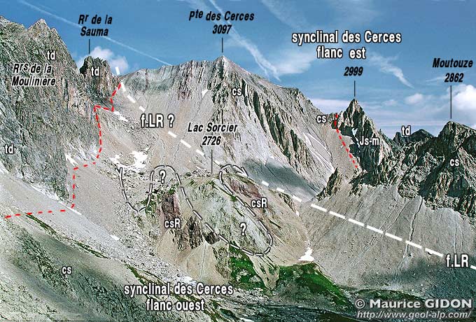 Le chaînon des Cerces domine, du côté est comme du côté ouest, des vallons ouverts dans des couches gréso-argileuses d'âge paléozoïque, appartenant au soubassement paléozoïque de la zone houillère briançonnaise. Par contre ses crêtes, essentiellement calcaires, sont sculptées dans la couverture mésozoïque de cette zone. Eles sy sont conserves à la faveur du grand synclinal synclinal des Cerces, d'axe N-S : on a là un typique relief inversé, même si le terme de "synclinal perché" est difficilement utilisable ici, car le coeur du pli n'est pas évidé par l'érosion et ses flancs profondément entaillés par des vallons orthogonaux à son axe.