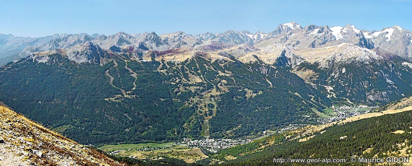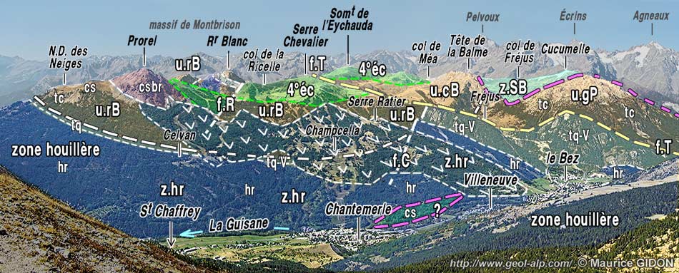Le domaine skiable de Serre Chevalier, en rive droite de la Guisane, vu du NE depuis la crête de Peyrolle. z.SB (en bleu pâle) = unités subbriançonnaises ; u.cB = unité de la crête de la Balme (rapportée à la nappe briançonnaise de la Condamine) ; u.rB = unité du Blanc (rapportée aussi à la nappe briançonnaise de la Condamine) [4°éc (en vert) = micaschistes "reconstitués" ; csbr (en pourpre) = brèches du Prorel] ; u.gP = unité du Grand Pré (rapportée à la nappe briançonnaise de Champcella). f.T = faille de Trancoulette ; f.R = faille de la Ricelle ; f.C = faille du Châtelas. Pour plus de détails sur les pentes supérieures de ce versant, voir les pages "Prorel" , "Serre Chevalier" et "Cucumelle". |