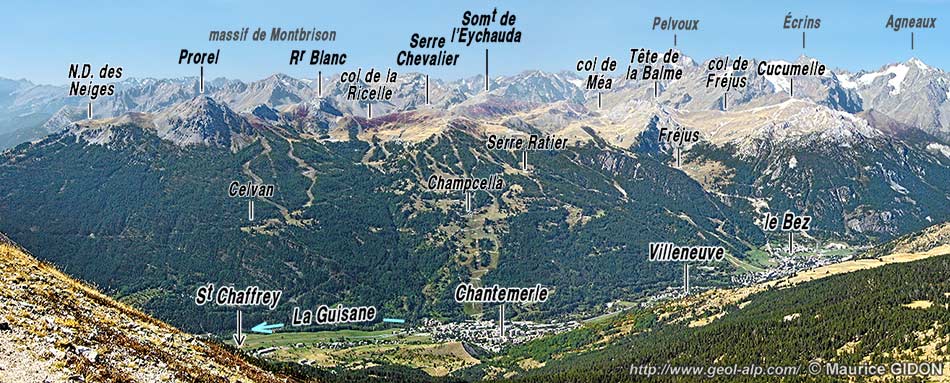 Au niveau de la station de Serre Chevalier, entre Le Bez et Chantemerle, les basses pentes du domaine skiable de rive droite de la Guisane est formée de pentes semi boisées coupées de petits ressauts. Ce relief est essentiellement dû l'importance du développement d'anciens glissements de terrain, dont la zone de départ était à peu près à l'altitude de Champcella et de Serre Ratier et dont le matériel provenait des ressauts qui ceinturent, au dessus de ces hameaux, le pied de la montagne de Serre Chevalier.