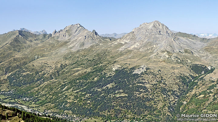 Les pentes de la rive gauche de la Guisane sont plus régulières et plus monotones ; elles sont constituées par les schistes argileux à bancs de grès du Houiller que recouvrent assez largement des alluvions glaciaires. Vers leur sommet elles sont couronnées par des buttes-témoin de terrains mésozoïques (Trias inférieur à Crétacé supérieur), appartenant à la couverture briançonnaise de la voûte de l'anticlinorium* briançonnais qui sont la terminaison méridionale des petits chaînons de Tête Noire et du Grand Aréa.