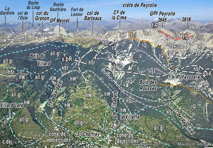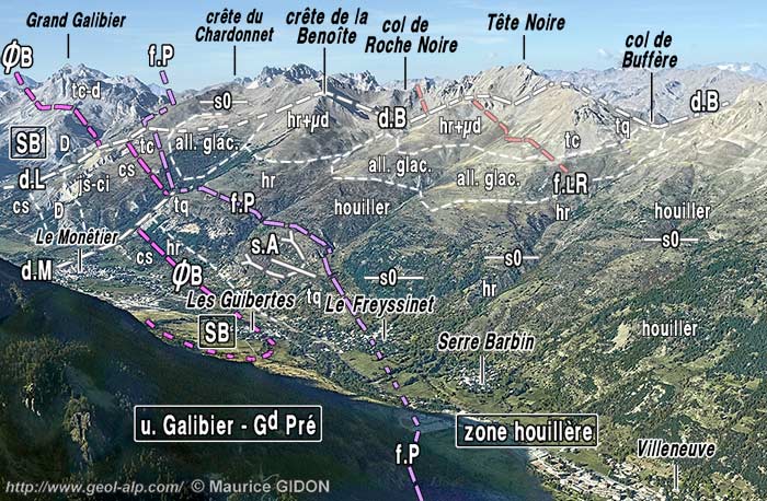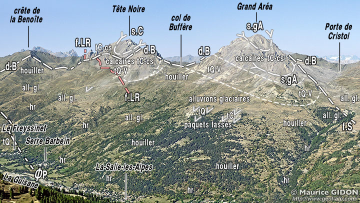 ![]() Les crêtes de rive gauche de la Guisane en amont de La-Salle-les-Alpes, vues du sud, depuis le col de Prorel. ØP = faille de la Ponsonnière (voir aussi la page Monêtier) ; s.C = synclinal des Cerces - Tête Noire ; s.GA = synclinal du Grand Aréa ; f.S = faille N-S de la Salle ; f.LR = prolongement méridional de la faille du Lac Rouge (voir page Béraudes) ; d.B = décrochement du col de Buffère (prolongement oriental de ceux du Lautare |