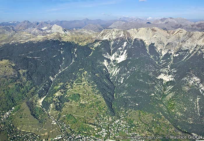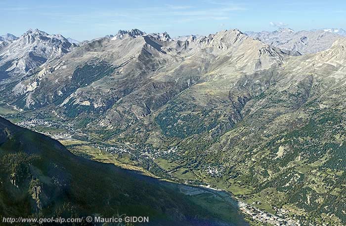 En aval de la transversale de Chantermerle (et surtout dans les pentes qui descendent vers Saint-Chaffrey) le versant de rive gauche de la Guisane est essentiellement formé par le matériel d'âge houiller (en grande partie masqué sous les alluvions quaternaires d'ailleurs). Mais ces couches grèso-schisteuses dessinent là un anticlinal du Granon déversé vers l'est, dont le plan axial passe au col de ce nom. De ce fait tous les terrains houillers de la partie du versant située à l'est de col sont disposés à l'envers (avec un pendage d'ailleurs grossièrement conforme à celui de la pente topographique, ce qui contribue à leur conférer une grande largeur d'affleurement).