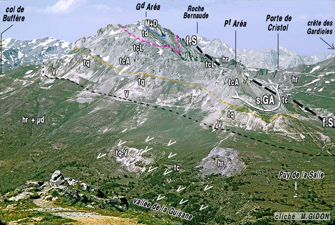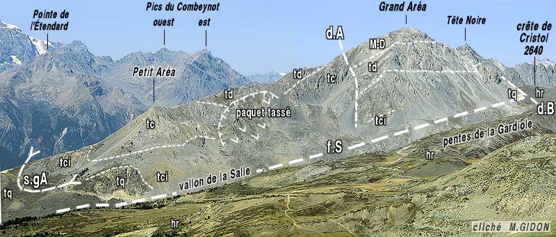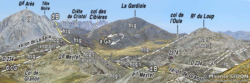 En premier lieu les schistes houillers des pentes méridionales du sommet de la Gardiole montrent une charnière déversée vers l'est. Cet anticlinal de la Gardiole (visible également sur le flanc nord de la montagne, cf page "Névache") représente le pli oriental de l'anticlinorium de la zone houillère : en effet, au delà du côté est, toute la succession de ce domaine, y compris son mésozoïque adhérent (formant l'unité de Roche Gauthier), est en disposition renversée.