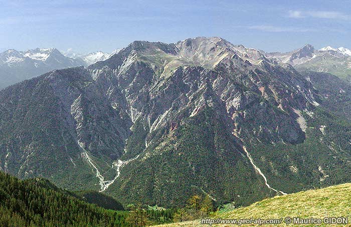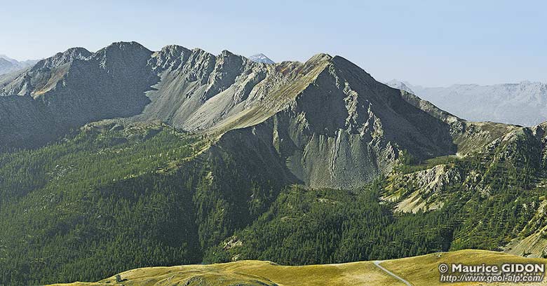 Dans les plus basses pentes du versant occidental, et notamment dans les abrupts qui se développent à l'est de Saint-Chaffrey et se poursuivent vers le sud jusque sous la Croix de Toulouse, la situation est différente : on y trouve en effet une succession carbonatée du Trias moyen disposée à l'endroit, qui repose sur une semelle siliceuse de quartzites et de Verrucano, puis de houiller, le tout dessinant une belle charnière anticlinale déversée vers l'est, visible dans les abrupts de la Croix de Toulouse (voir cliché ci-dessous).
