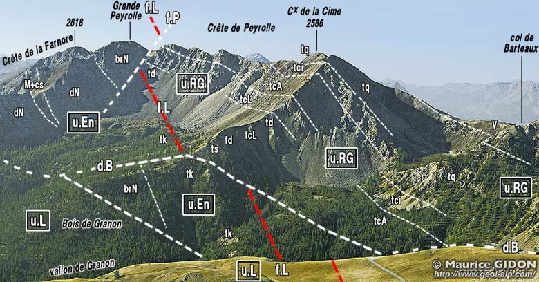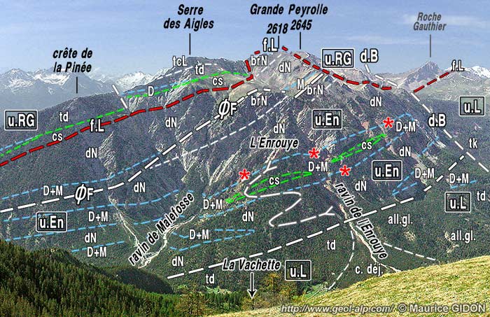 Cette cassure met cette succession en contact latéral avec celle de l'unité de l'Enrouye qui se développe sur presque toute la hauteur des puissants contreforts orientaux de la crête. Cette dernière unité se différencie nettement de la précédente par son Trias carbonaté, qui est formé de brèches carniennes surmontées d'épaisses dolomies noriennes et qui est souvent associé à de puissantes masses de gypses et cargneules (on en trouve ici un témoin en rive droite du vallon de Granon) . Elle représente assez clairement l'équivalent, au nord de la Durance, de celle de la crête des Granges, au sud.