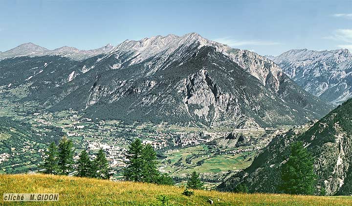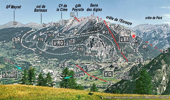 Vers le sud, le dispositif structural de la crête de Peyrolle est tranché par les abrupts qui dominent la route N.94 à l'est de la Croix de Toulouse (ils en donnent d'ailleurs une coupe assez démonstrative). En fait il semblent être tranchés là une faille presque E-W, l'accident de Briançon car il ne paraît pas possible de reconnaître la même succession structurale dans le pentes septentrionales de la montagne de l'Infernet (voir la carte structurale ci-après et, pour plus de détails, les pages "Infernet" et "Briançon").